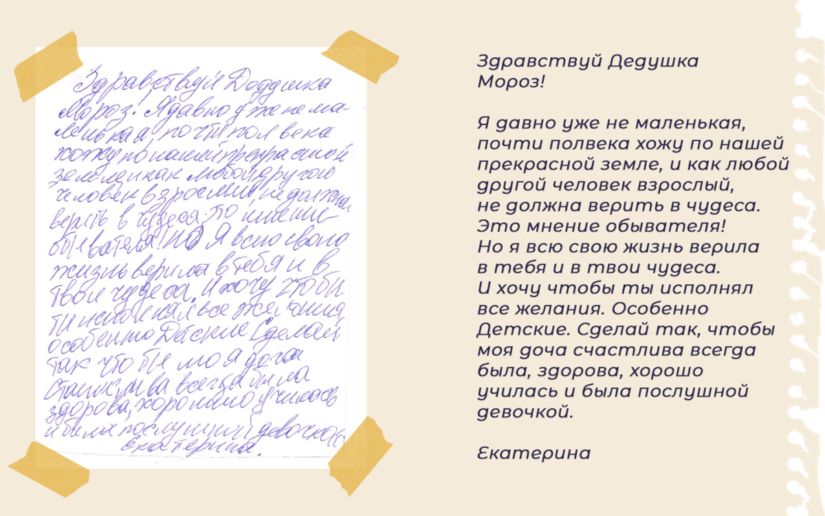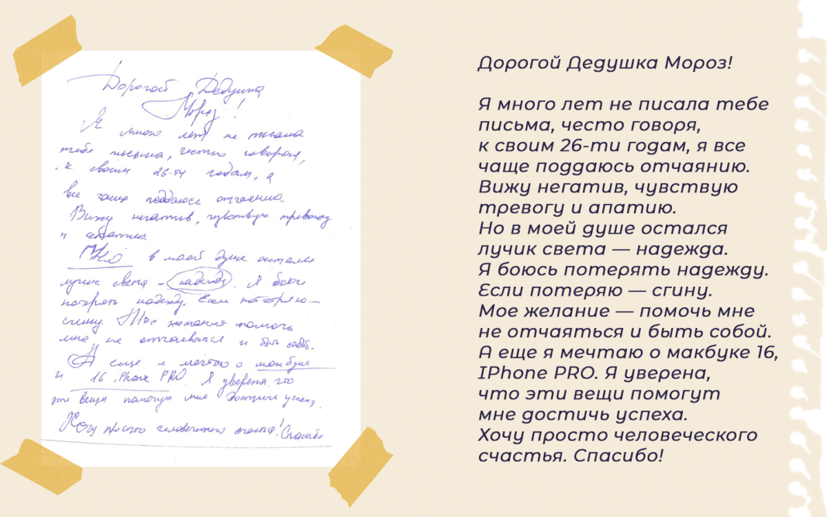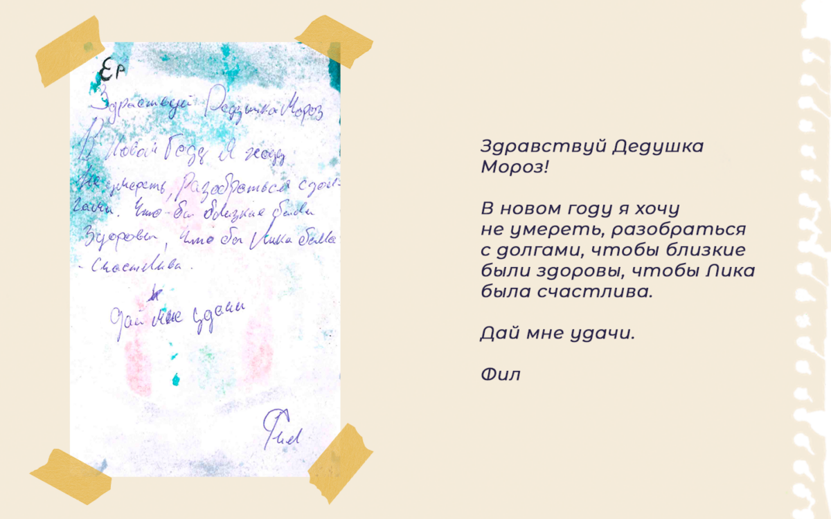 В январе мы отсканировали письма и хотим поделиться с вами. В некоторых — сложно разобрать почерк. Чтобы читать было проще, сделали баннеры, на которых слева прикрепили письмо, а справа поместили «расшифровку» (пунктуация авторов сохранена).